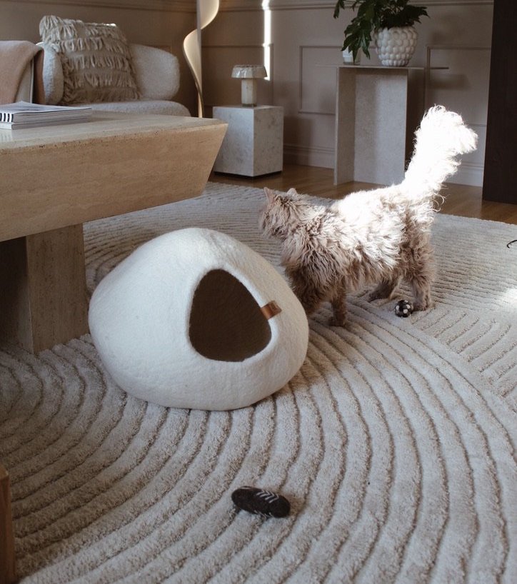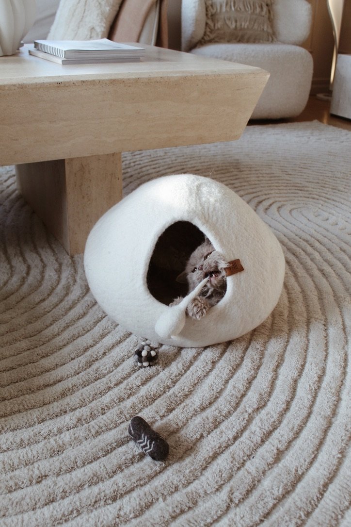 Ull är ett naturligt och luftigt material som skonsamt reglerar temperaturen — det håller din katt varm och mysig på vintern och sval på sommaren. Till skillnad från syntetmaterial tillåter ull luften att cirkulera, vilket skapar en balanserad och inbjudande viloplats året runt.