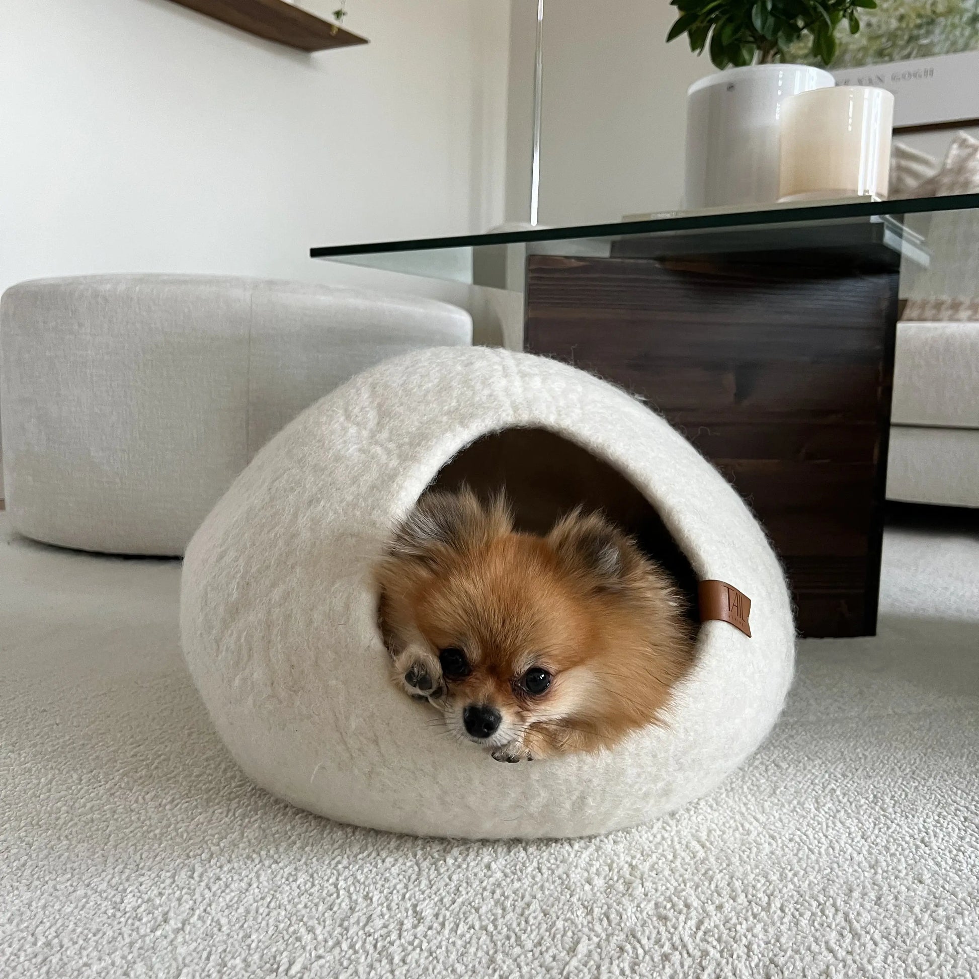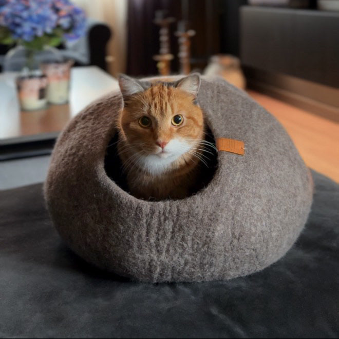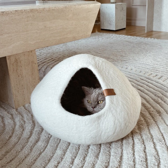 Cassius Kattbädd är handfiltad av 100 % ekologisk ull, vilket gör den till en perfekt plats för din katt att mysa och koppla av. Med sin stilrena design passar den perfekt in i ditt hem. Ullen har ingen utmärkande doft och detta material fungerar som en termostat, vilket gör den idealisk för att hålla din katt varm på vintern och sval på sommaren. Den är handgjord, vilket gör varje kattbädd unik.