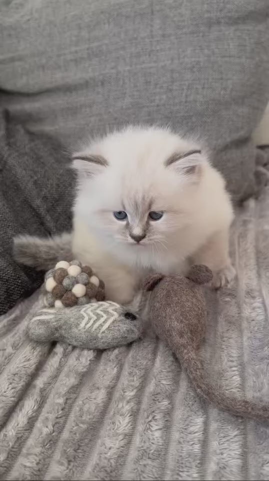 Ha kul med din katt med detta 3-pack kattleksaker. Kattleksakerna innehåller en boll med bjällra, en mus och en fisk, var och en designad för att ge oändliga timmar av underhållning. Handgjorda av 100 % ekologisk ull, dessa leksaker garanterar hållbarhet och livslängd. Förpackningen kommer i en 100% jutepåse, perfekt för förvaring av leksakerna mellan lekstunderna.