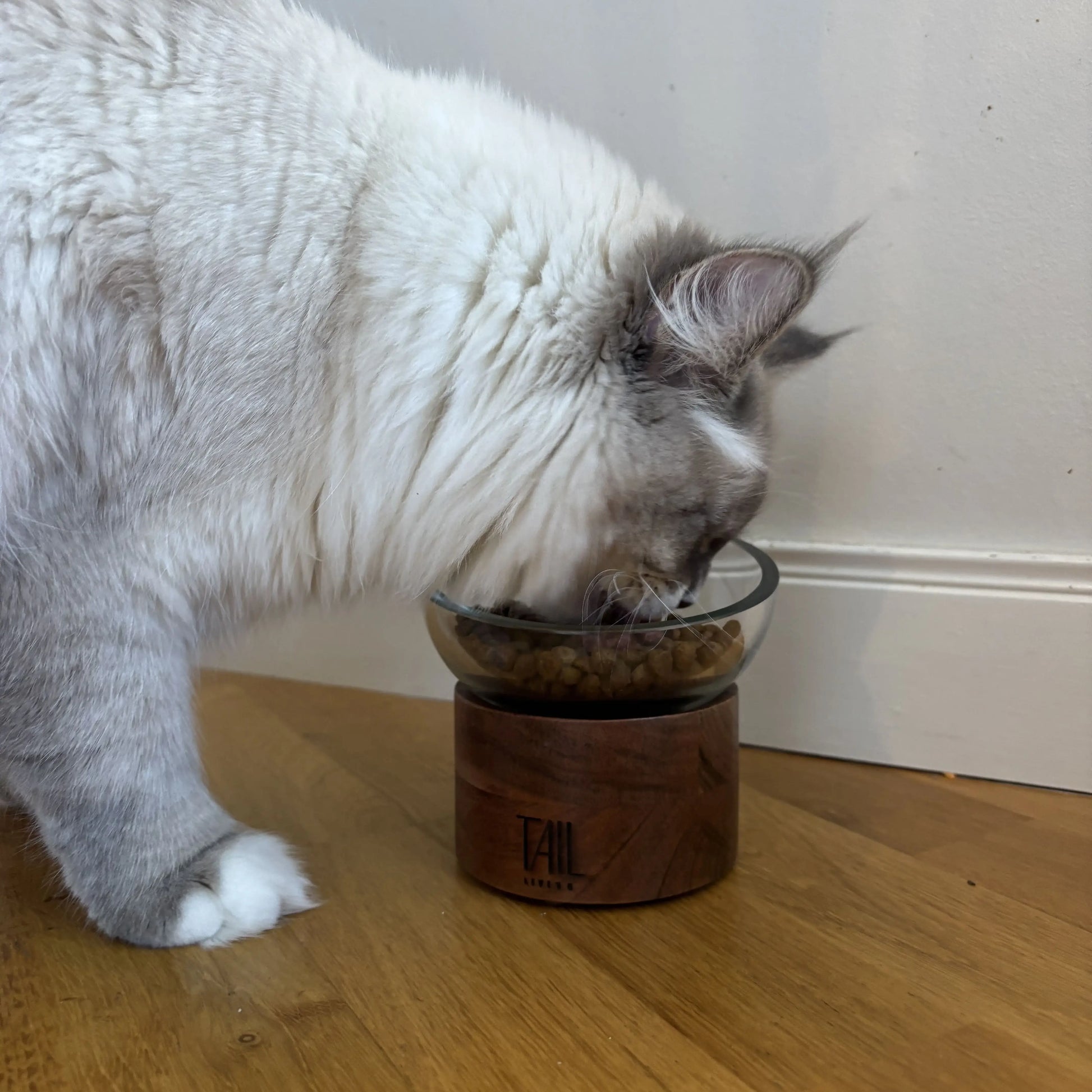 Som en del av TAIL Studio är River Matskål en elegant och funktionell kattmatsskål designad för att kombinera komfort, hälsa och estetik. Skålen är handblåst av återvunnet glas, vilket ger varje exemplar en unik karaktär, och står på en specialdesignad bas i 100% FSC-certifierat akaciaträ, som ger ett naturligt och stilfullt uttryck i ditt hem.